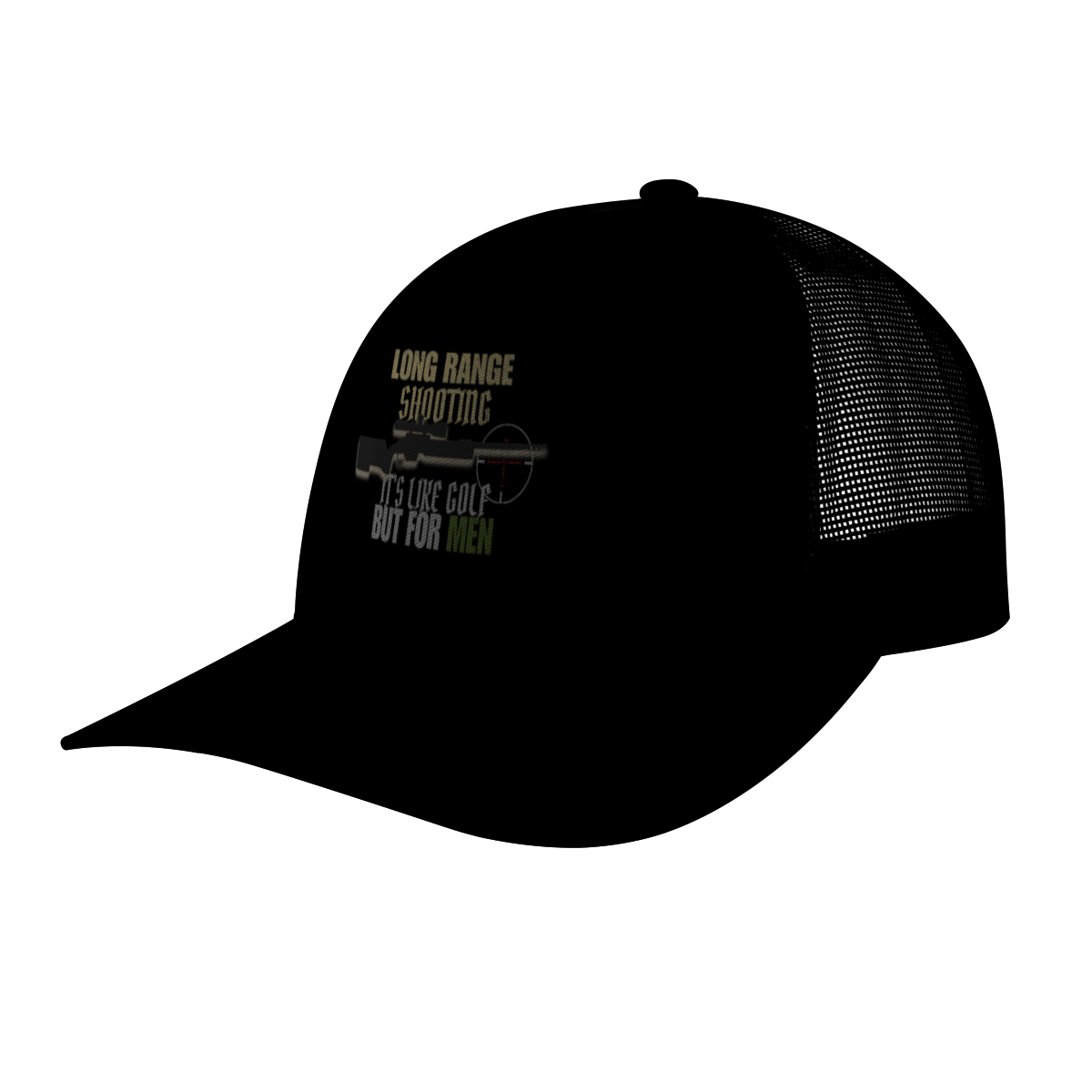 Boné estilo trucker com a frase “Long Range Shooting. It’s like Golf, but for men.” Uma provocação direta, com identidade tática e toque de ironia. Ideal para quem entende que precisão é um esporte de verdade.