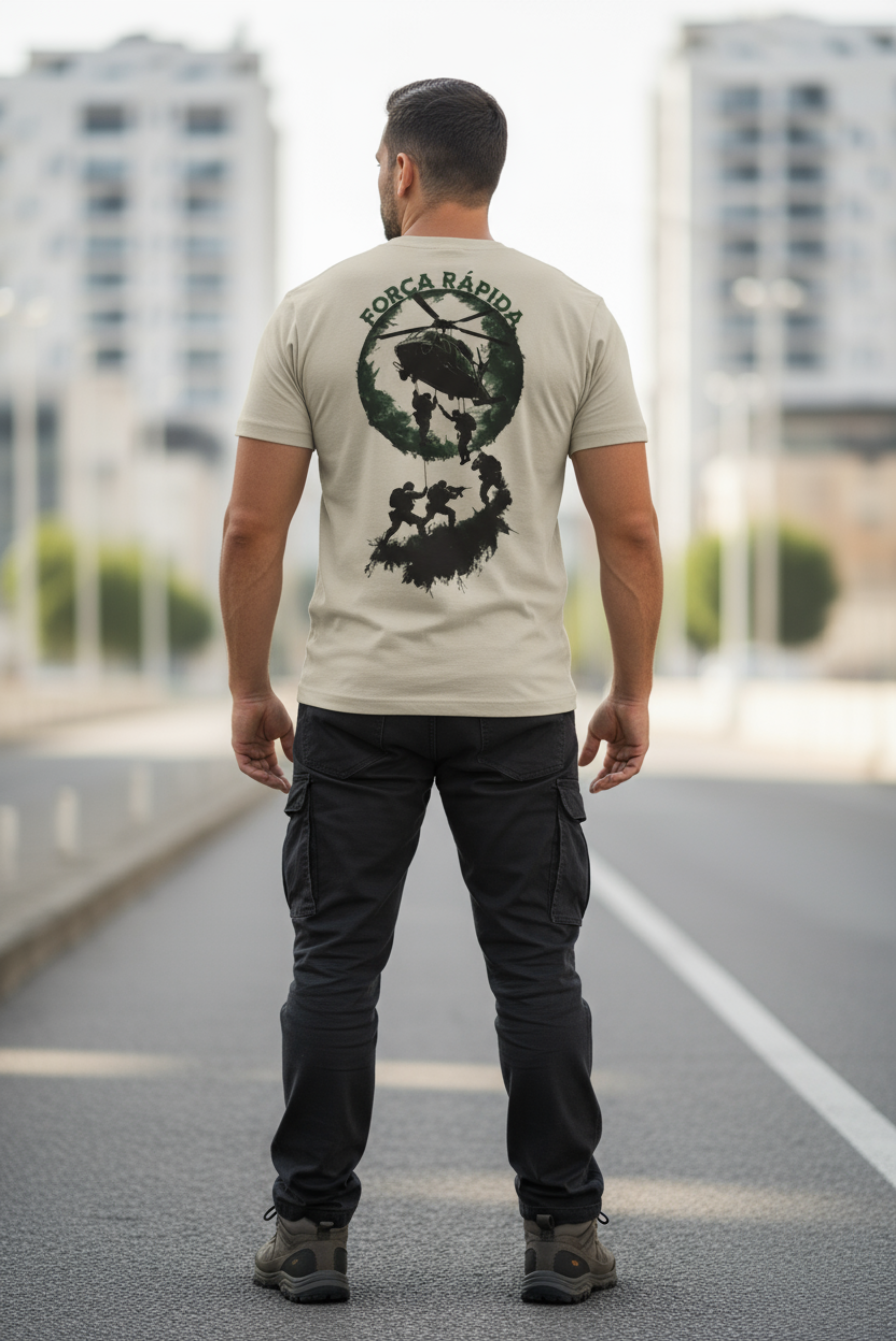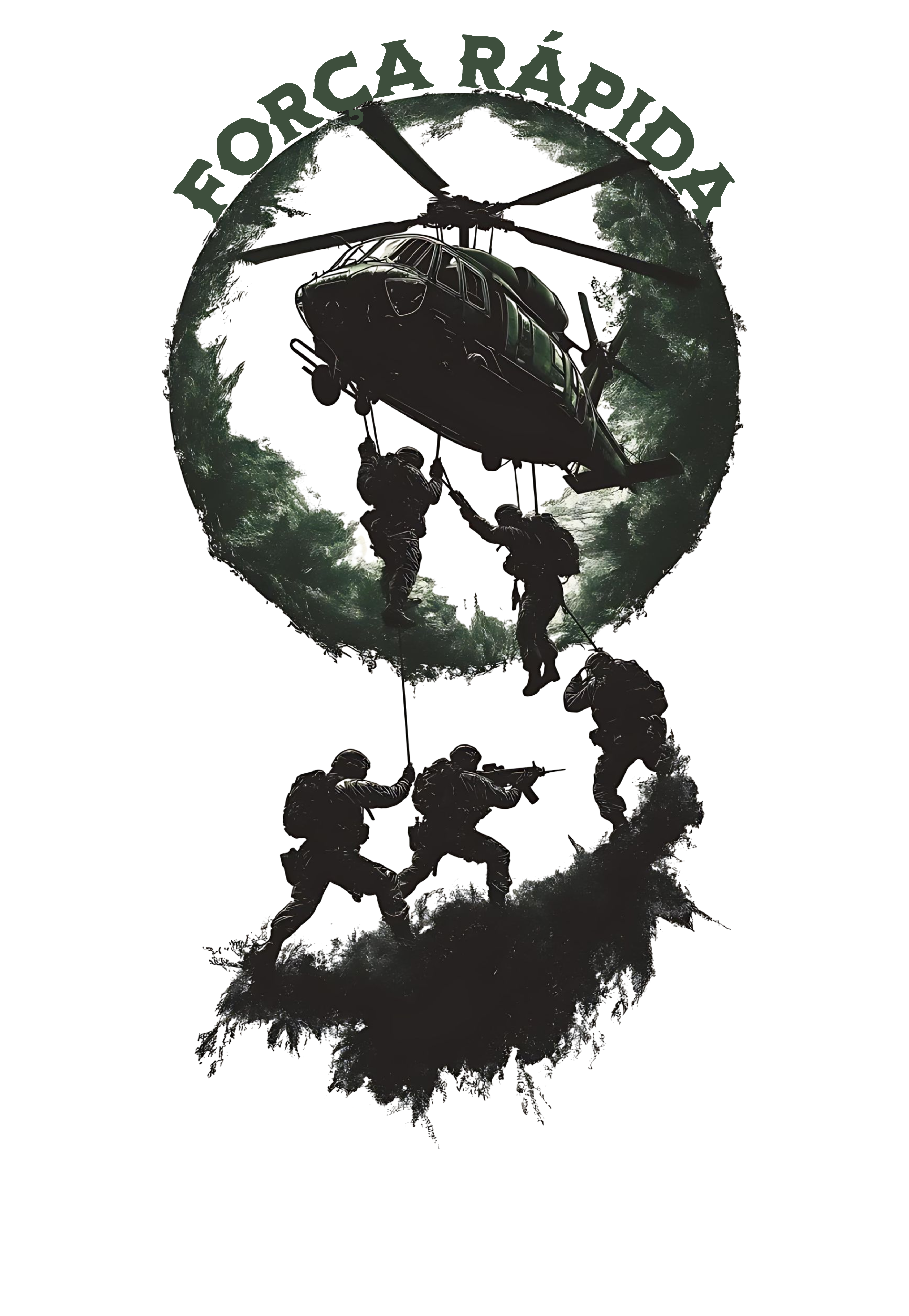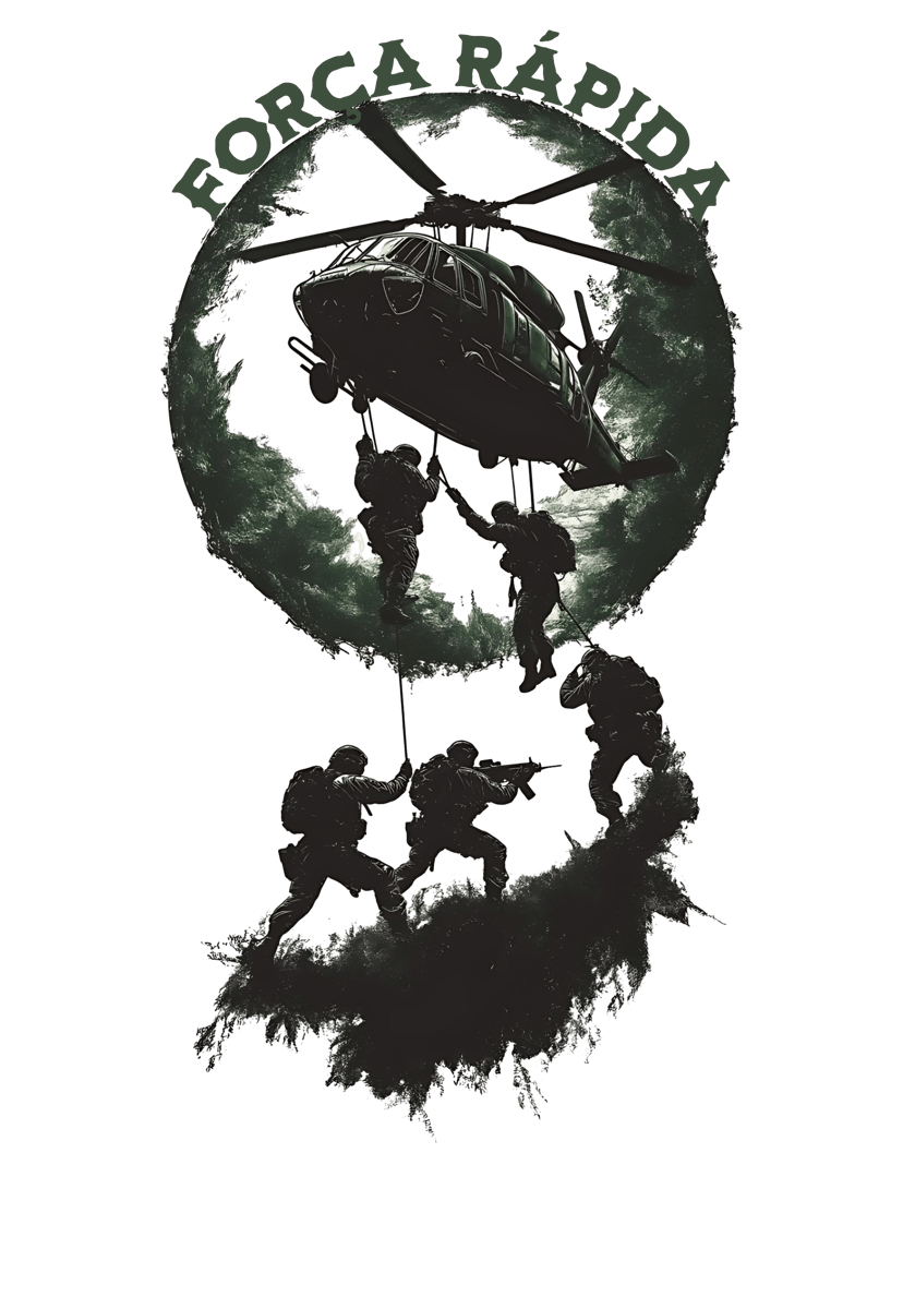A estampa Força Rápida representa o espírito das operações aeromóveis: infiltração vertical, tomada de terreno e domínio absoluto do ambiente hostil.