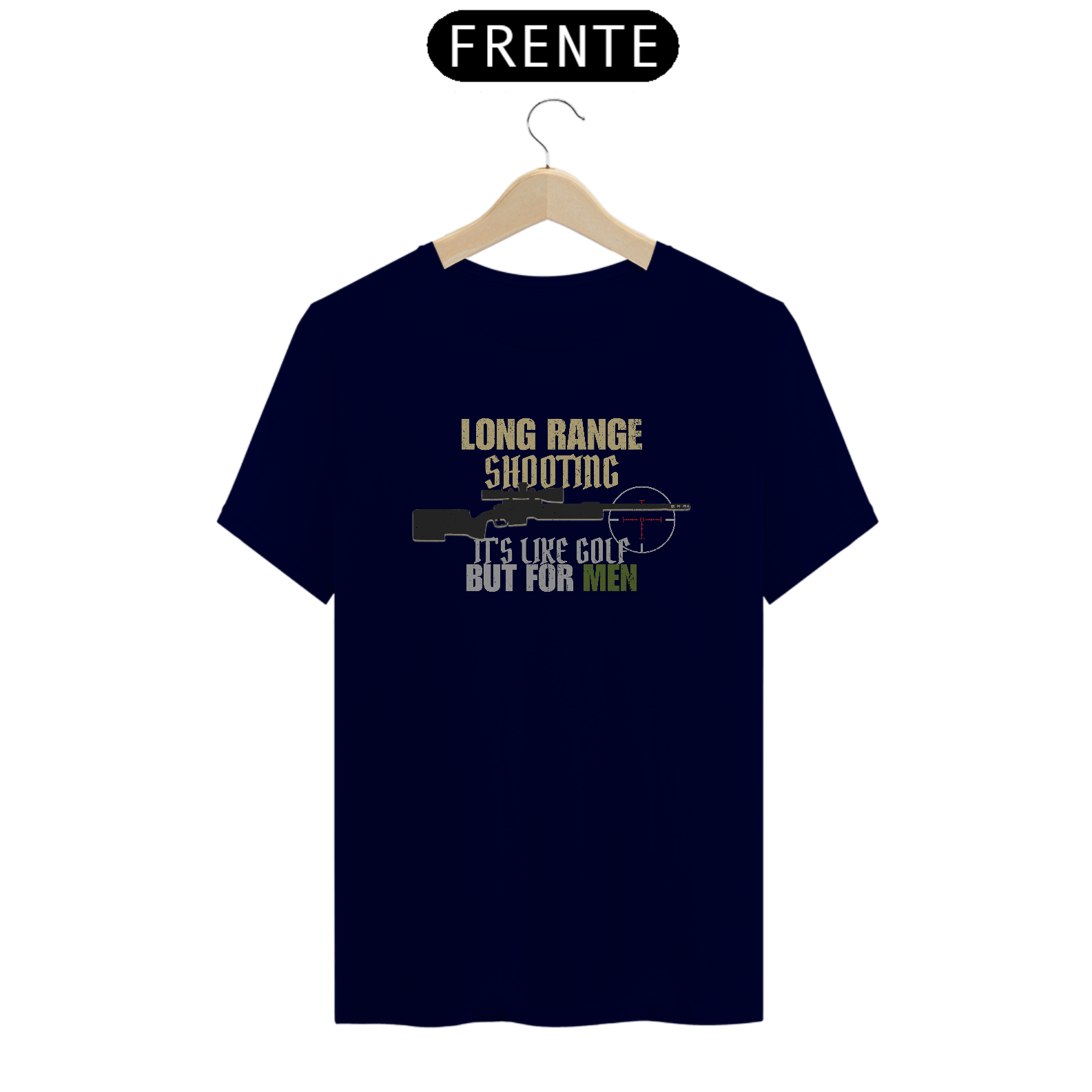 Uma estampa com humor ácido e identidade forte. “Long Range Shooting – It’s Like Golf, But for Men” é pra quem sabe que precisão exige paciência, cálculo e frieza.