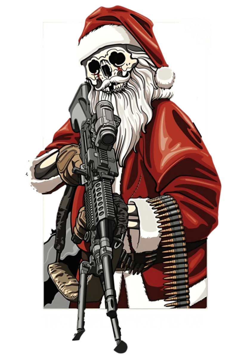 Com traços detalhados e composição imponente, essa peça carrega o espírito natalino versão tática — brutal, sarcástico e cheio de atitude.