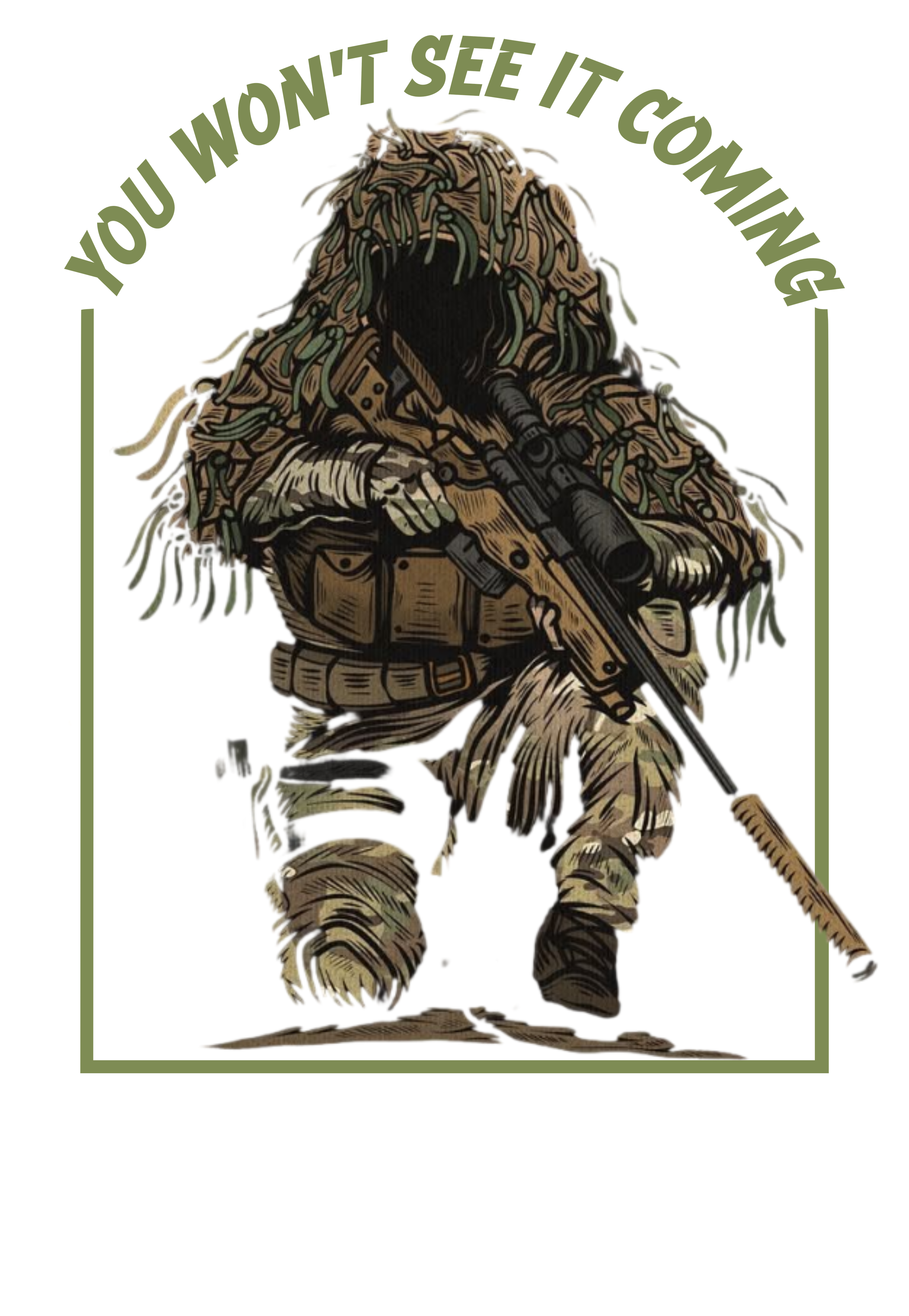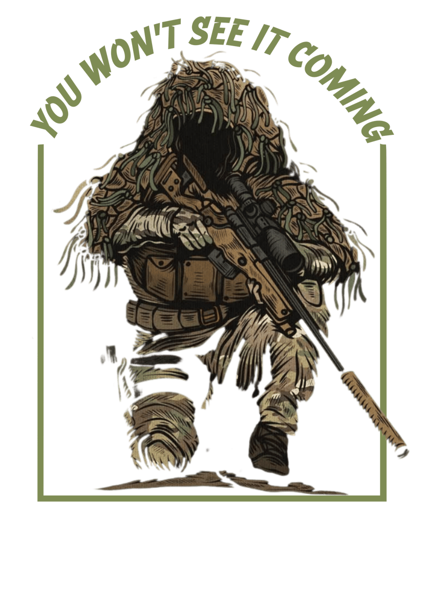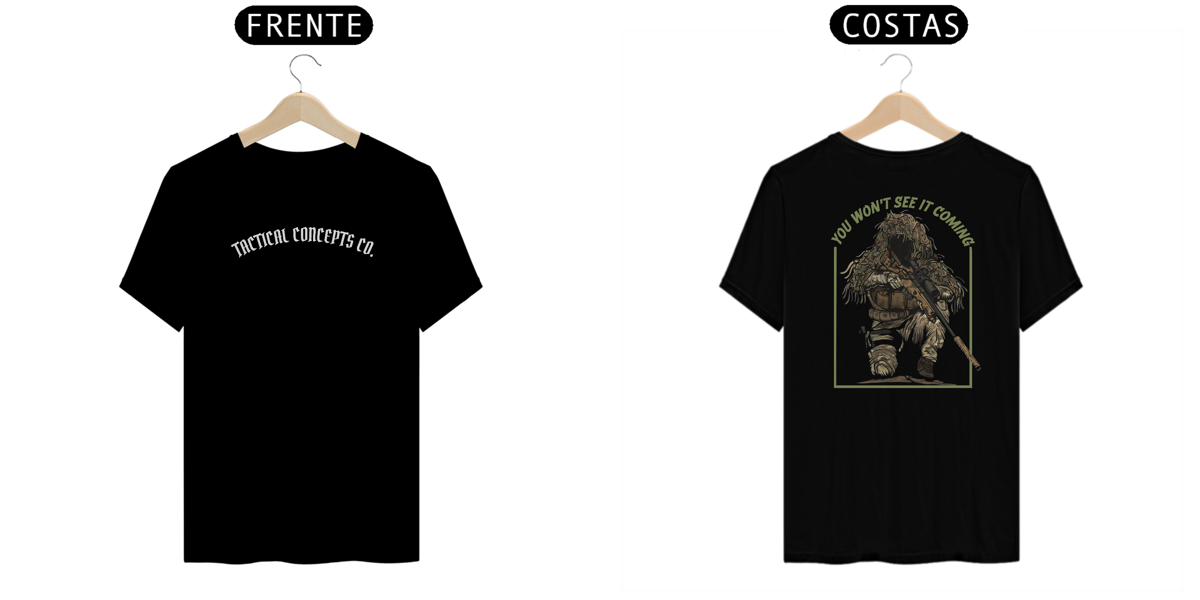 A estampa “You won’t see it coming” carrega o espírito do atirador oculto: precisão, paciência e domínio do ambiente.