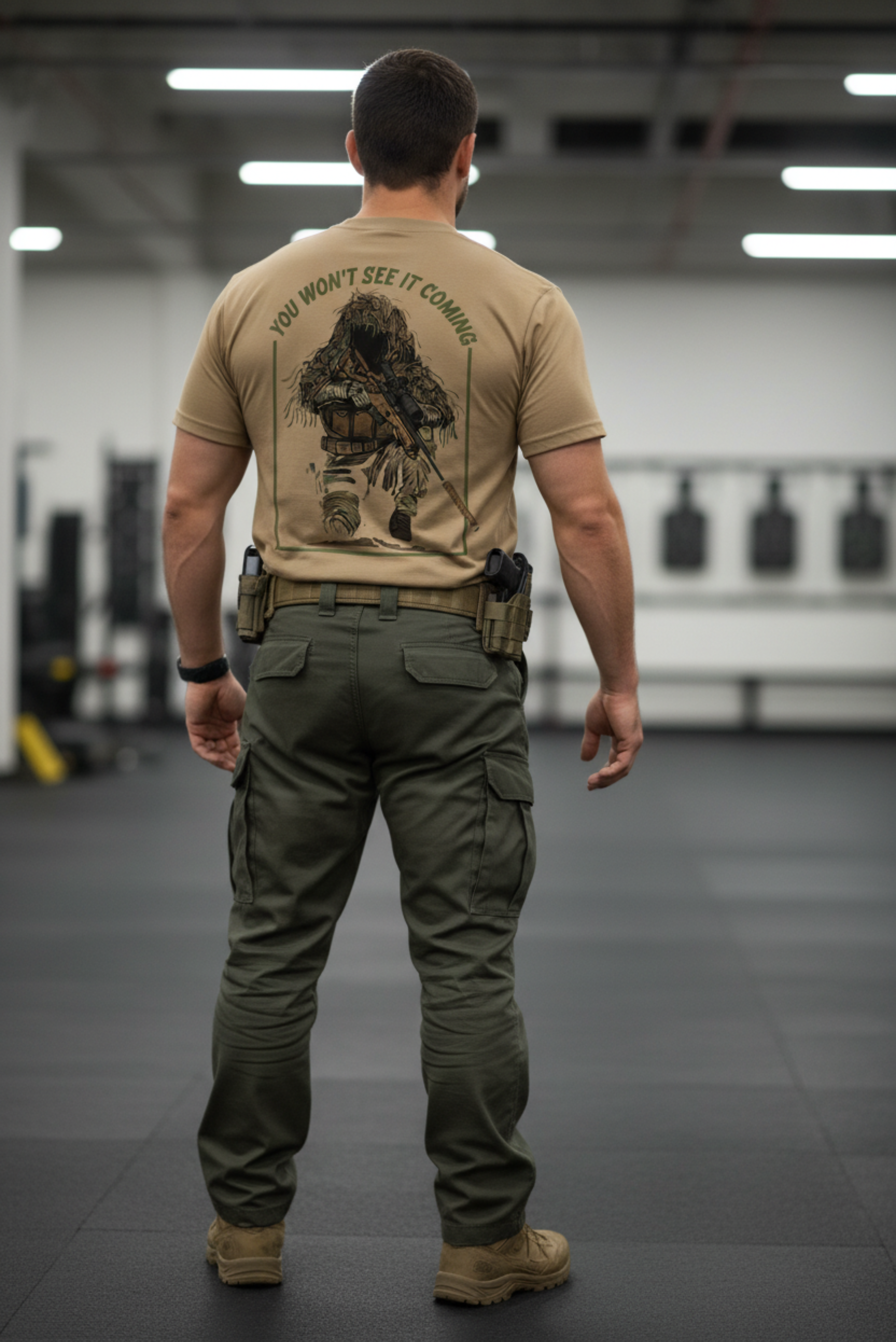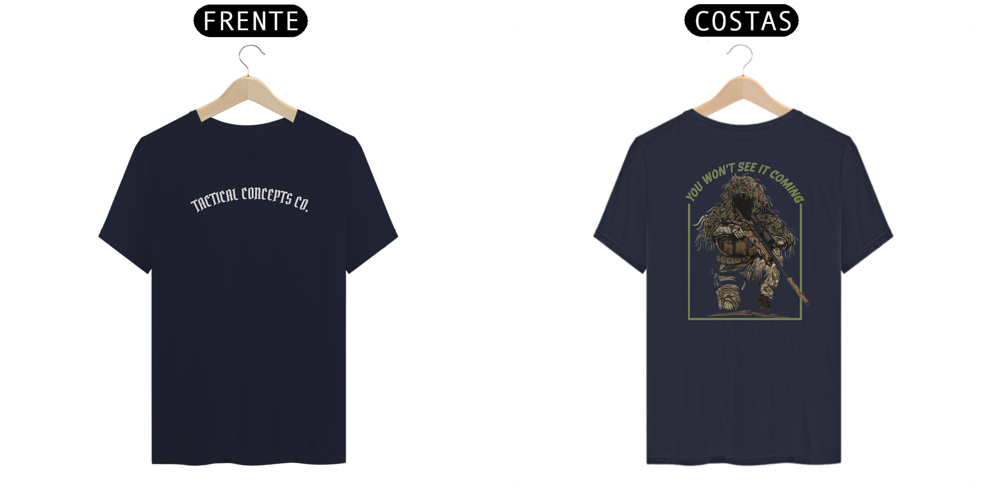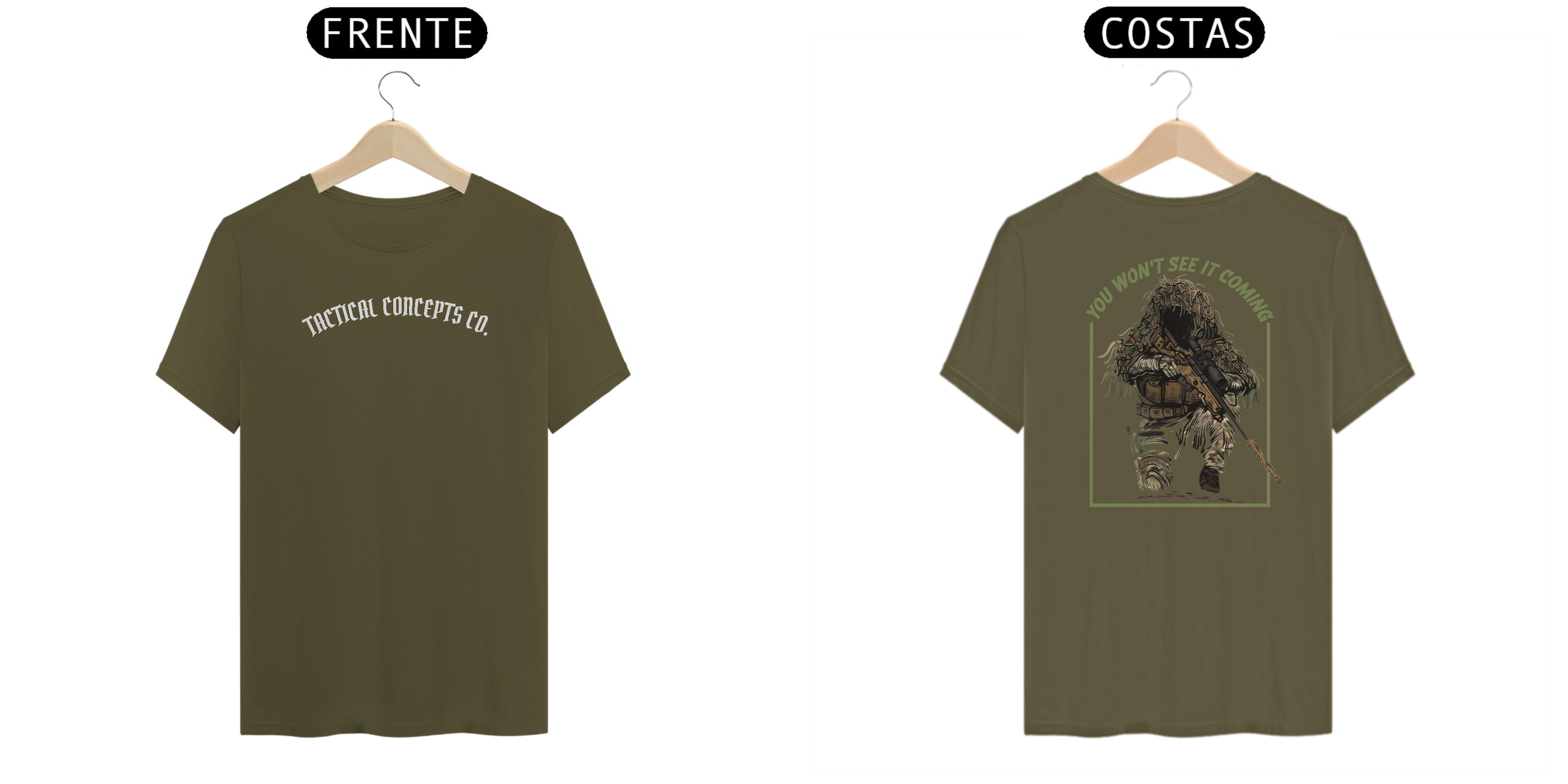 A estampa “You won’t see it coming” carrega o espírito do atirador oculto: precisão, paciência e domínio do ambiente.